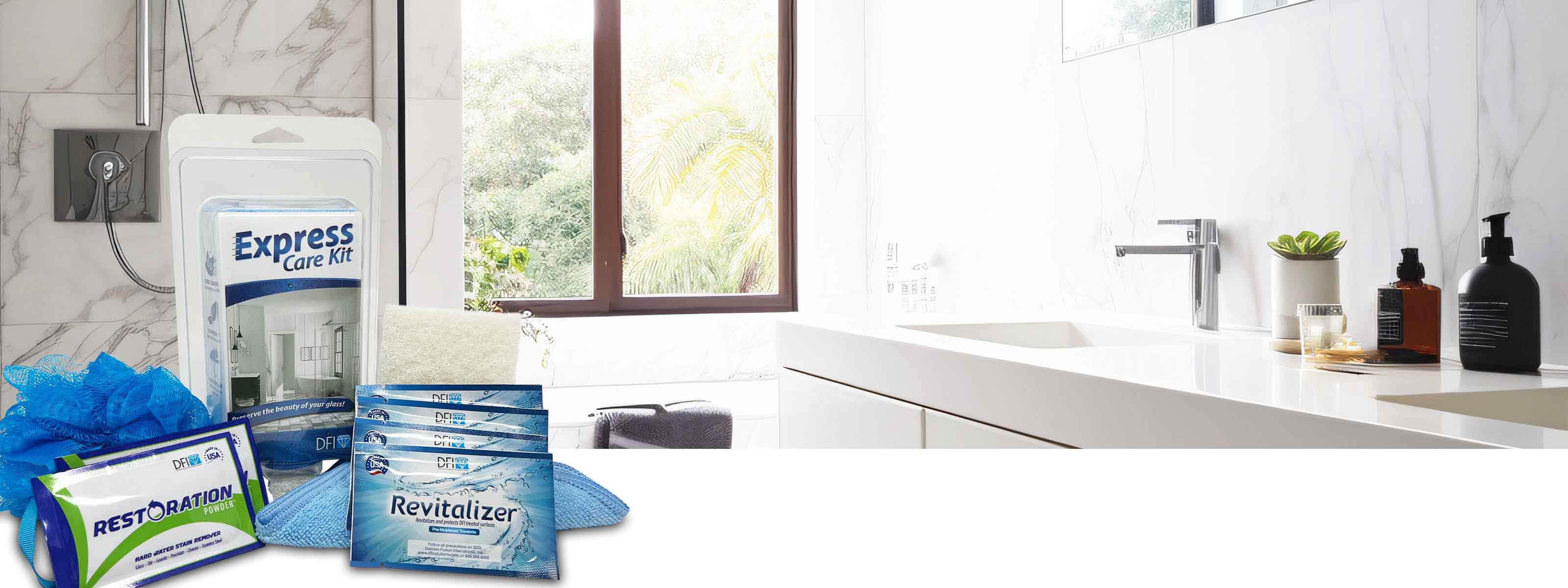 If your glass surfaces start to form stains or the DFI protective coating applied to the glass begins to wane, look no further than DFI’s aftercare products. Each product (kit) has everything you need to keep your glass surfaces looking beautiful – whether you need to remove unwanted hard water stains and soap scum or cut cleaning time by applying an easy-to-clean glass coating.