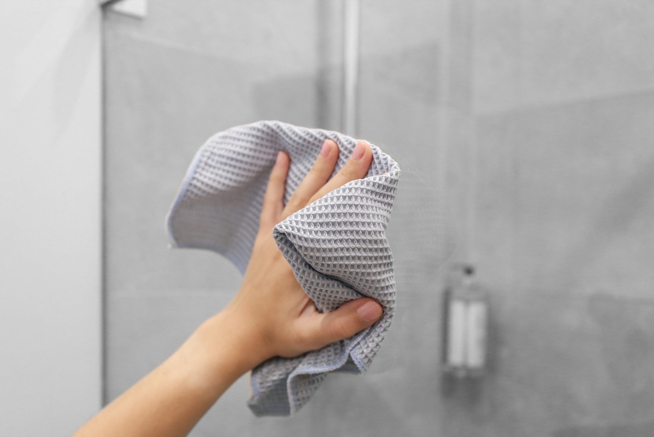 For best results, rinse the shower glass after each use and wipe down any remaining droplets. You may also towel dry the surface or use a squeegee. Once a month, wet the shower glass and use a nylon body puff to go over the surface until clean and smooth. Then rinse and dry the glass.