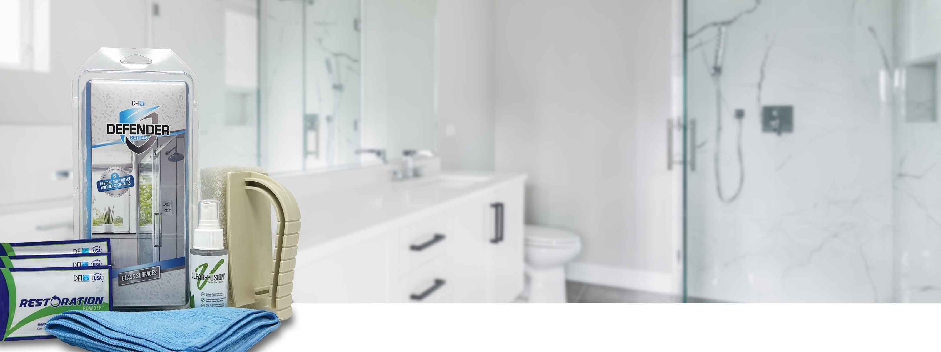Restore and protect your glass surfaces with DFI’s Glass Defender™ shower glass treatment kit. Created as an all-in-one package, the kit includes everything you need to remove unwanted stains off your glass and then protect it with a water repellent coating. The application process is easy and can be applied to a wide range of surfaces, including shower doors, mirrors, glass railings, windows, and more.